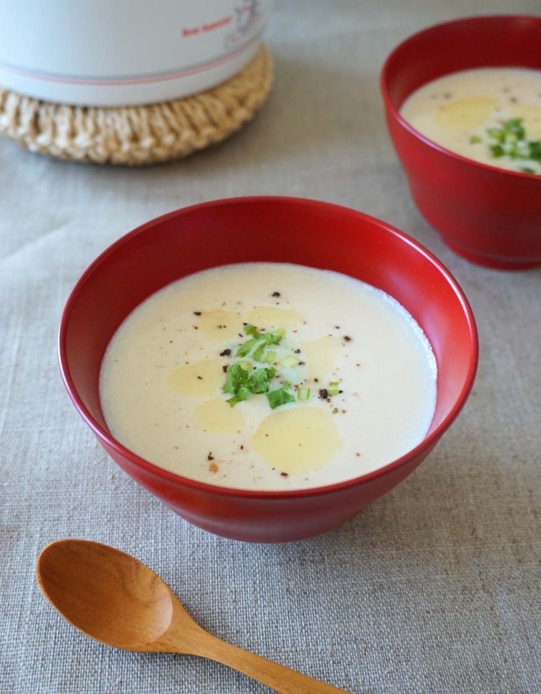 - 粗熱をとり、ミキサーに工程②とAを入れよく混ぜなめらかにし、味をみて必要であれば塩を加える。
