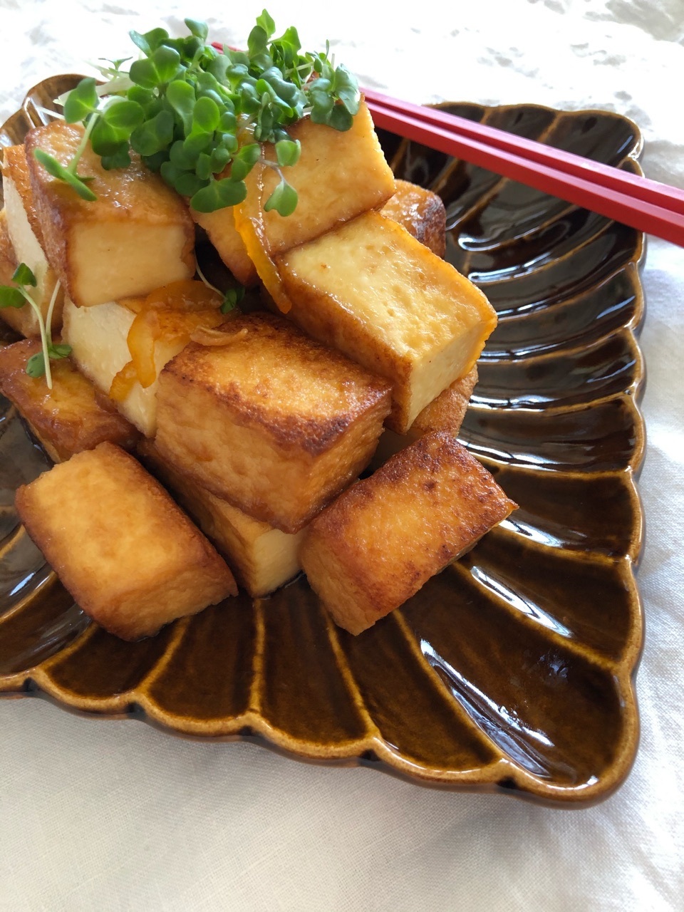 - ポン酢マーマレードソースを厚揚げと絡めながら焼く。器に盛り、かいわれ大根をかざる。