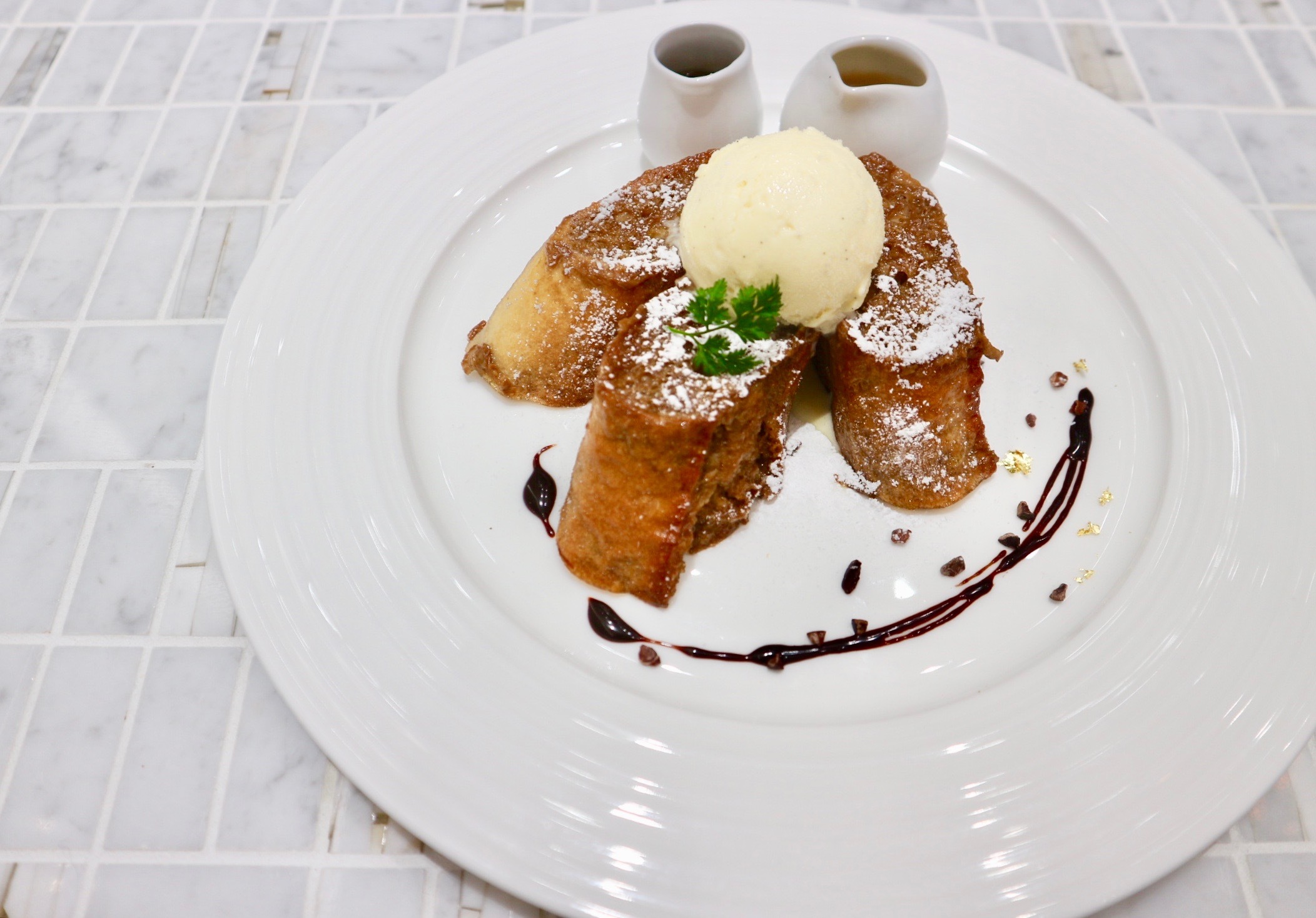 - 器に並べ、バニラアイスをのせ粉糖をかけ、エスプレッソを添える。
