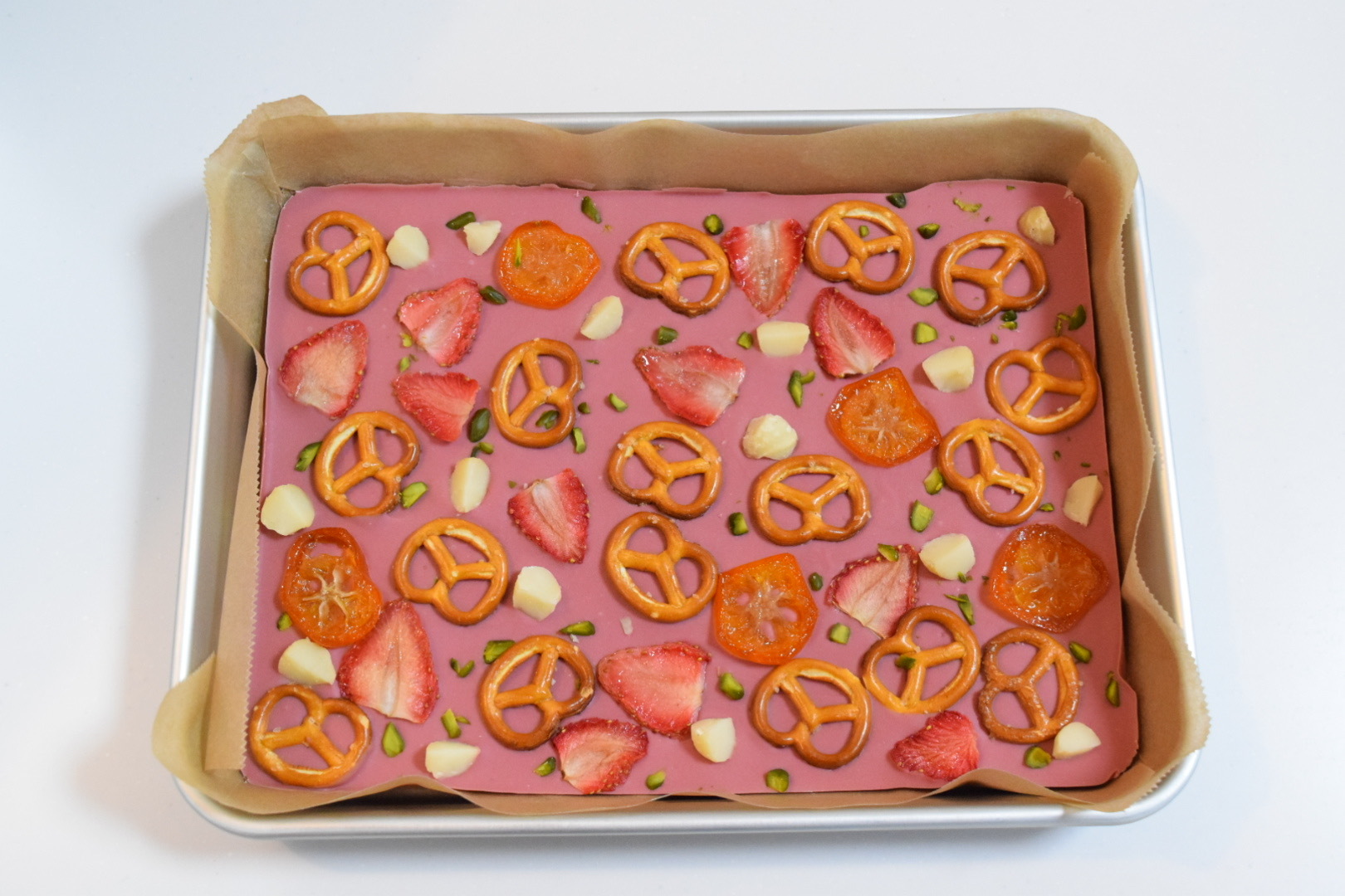 バットに流して均一にならす。イチゴ、プレッツェル、お好みのトッピングを並べる。