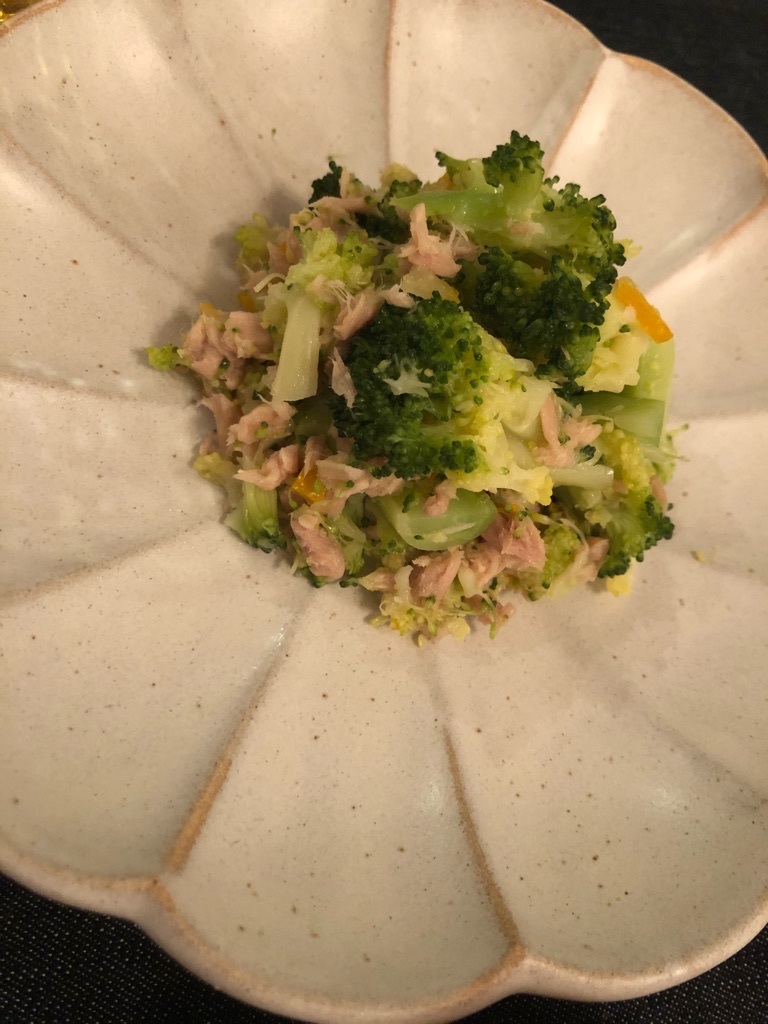 - ブロッコリーを小房に切りる。柚子の皮をみじん切りにする。ブロッコリーをフライパンにいれ、オリーブオイル、塩、水をいれ蓋をして中火に3分かける。