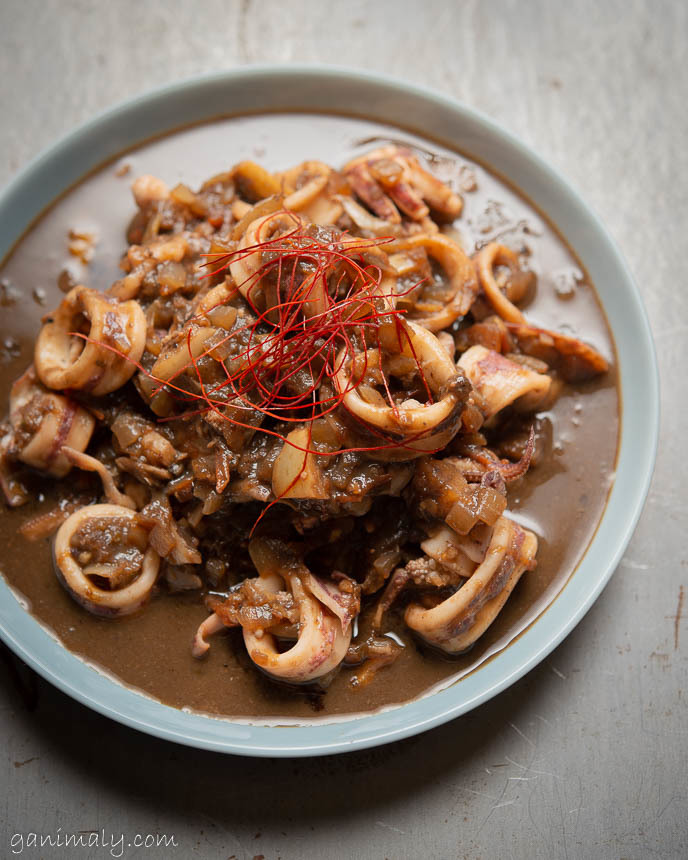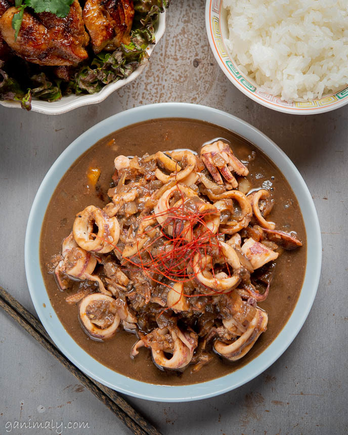 フィリピンの家庭料理の定番と言えば酢を使った煮込み料理の「アドボ」。イカを使ったものもよく食べてるようです。酸っぱさと甘さがご飯に合います。