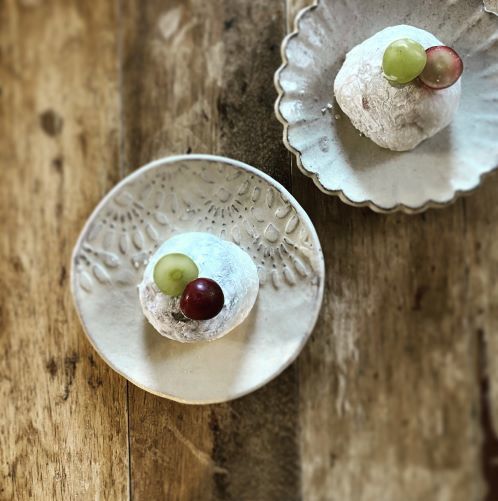 - フルーツとあんこを4個に分け、あんこでフルーツを包む。