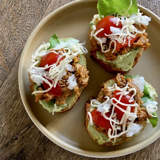 トルティーヤを使わず、身近にあるバゲットでタコス風ブルスケッタを作りました。ビールに合う一品です。ホームパーティーやアウトドアでも活躍する、簡単でお手軽なパーティーフードです。