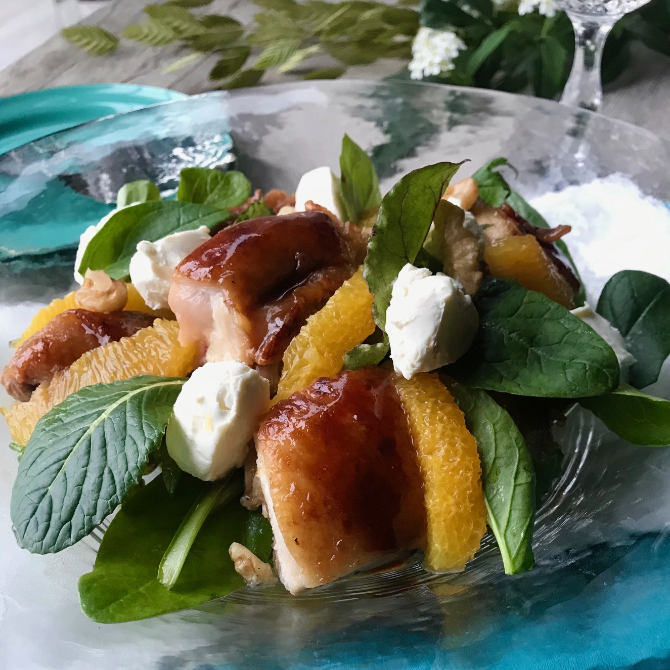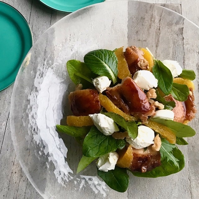 - 器にベビーリーフ・鶏肉・オレンジを盛り4.でフライパンに残ったソースをかける。クリームチーズをスプーンで形づくって乗せ、くるみを散らす。