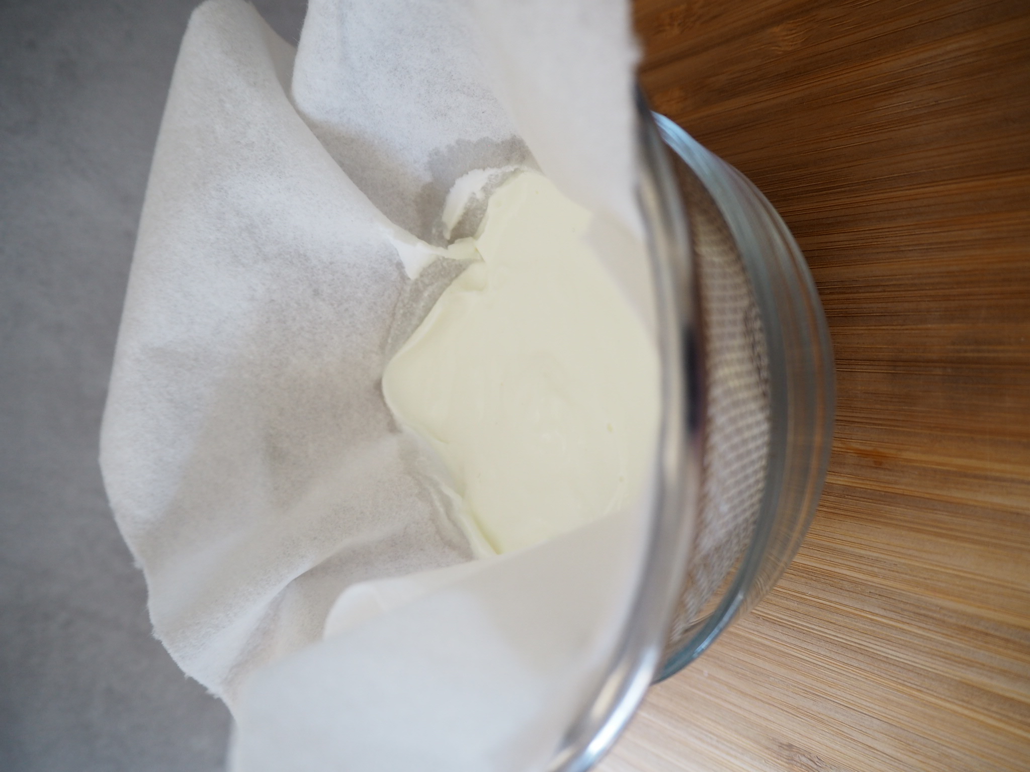 ・ヨーグルトはペーパーで包み、ザルに置きしっかりめに水気を切っておく。(3h〜)