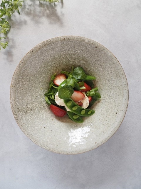 - 別のボウルに苺・スナップえんどう・クレソン・くるみを入れ、オリーブ油でざっくりと和える。