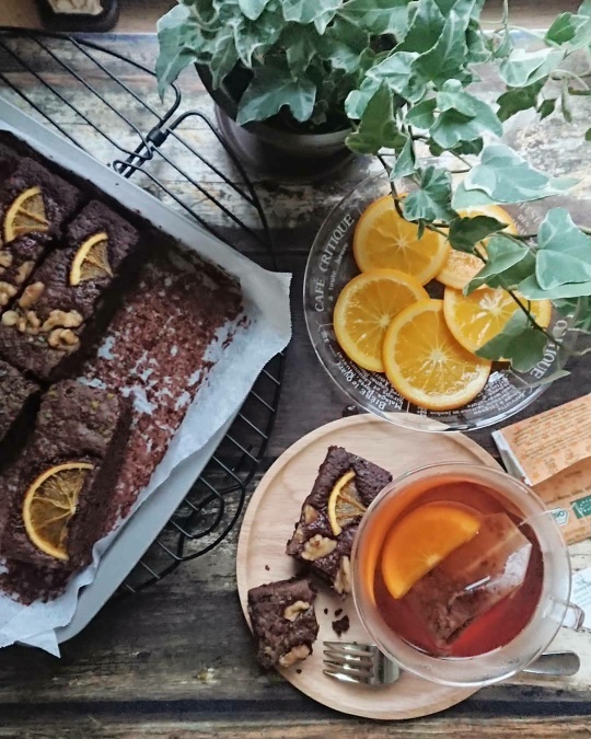 - 紅茶をカップに注ぎ、輪切りオレンジを浮かべる。