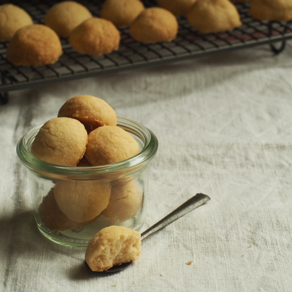 - 3.手で2cm程度の大きさに丸め、天板に隙間をあけて並べたらオーブンで10~15分加熱。天板に接した面がうっすらきつね色になるまで焼き、焼きあがったら天板の上で粗熱をとり、網の上冷にのせて冷ます。