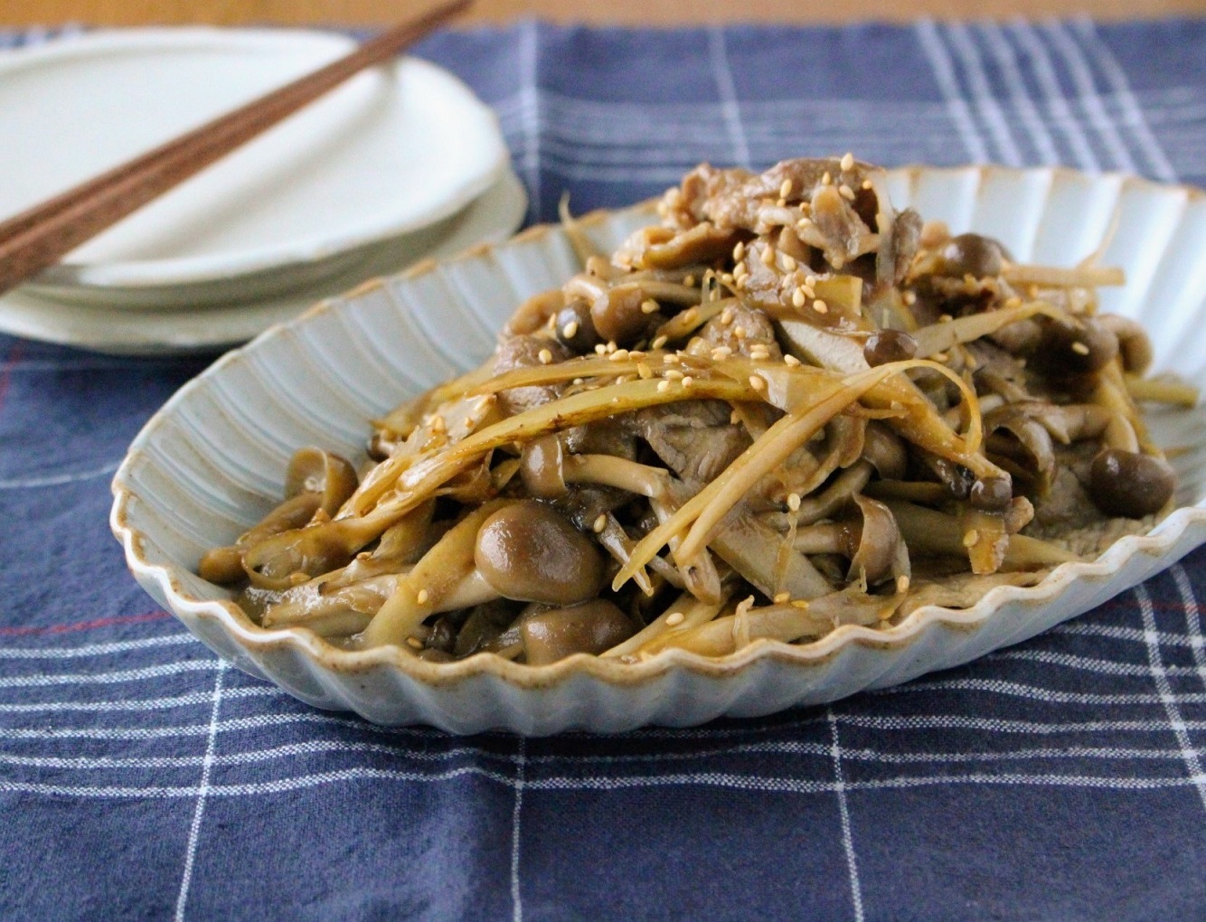 - フライパンに米油を熱し、豚バラ肉を入れ中火で炒める。豚バラ肉の色が変わったら、ごぼうを入れ炒め、Aを入れ汁気が少なくなるまで炒め白ごまを入れ混ぜ、器に盛る。