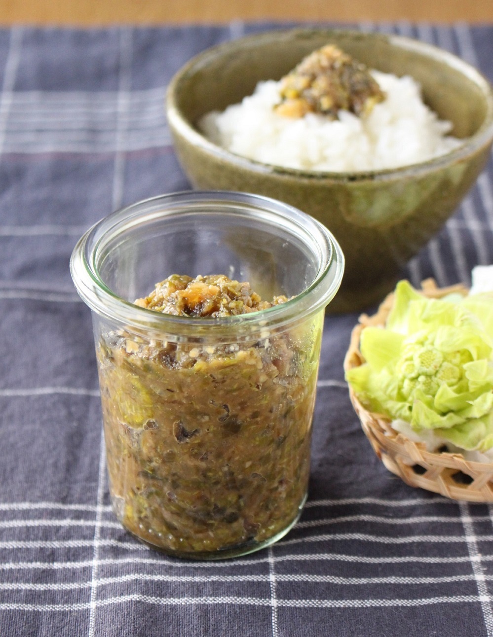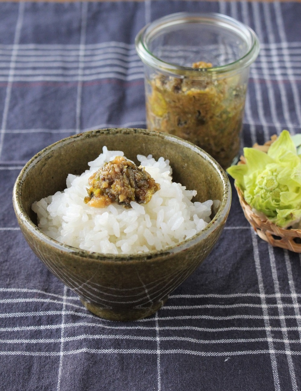 - フライパンに菜種油を熱し、ふきのとうを入れ中火で炒める。全体に油がまわったら、弱火にし、Aを入れつやが出るまで混ぜ練り混ぜ、粗熱が取れたら保存用容器に入れる。