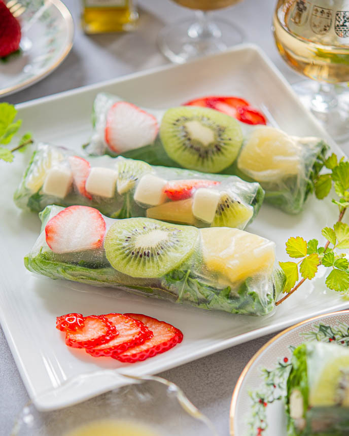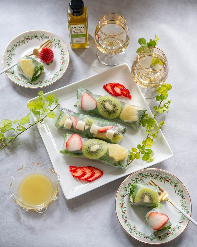 きつめに巻くこと、それぞれの生春巻きの横幅をそろえると見た目が綺麗に仕上がります(例では横幅13cm)。フルーツの切り方や並べ方の変化でデザインは色々とアレンジできます。使用するフルーツの量が少ないので、スーパーのカットフルーツを利用するのも良いかもしれません。