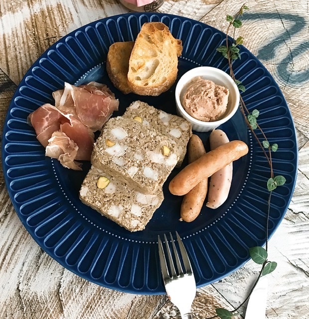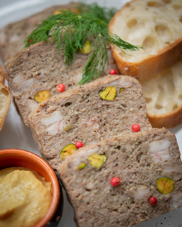 - 作ったタネを6等分にして3等分型に入れタネをならし、ピスタチオを入れ残り3等分を入れて整え型を落とし空気を抜く。ローリエをタネの上に並べてラップで蓋をする。