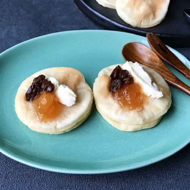 - クリームチーズを塗り、あんずジャム、レーズンを乗せる。