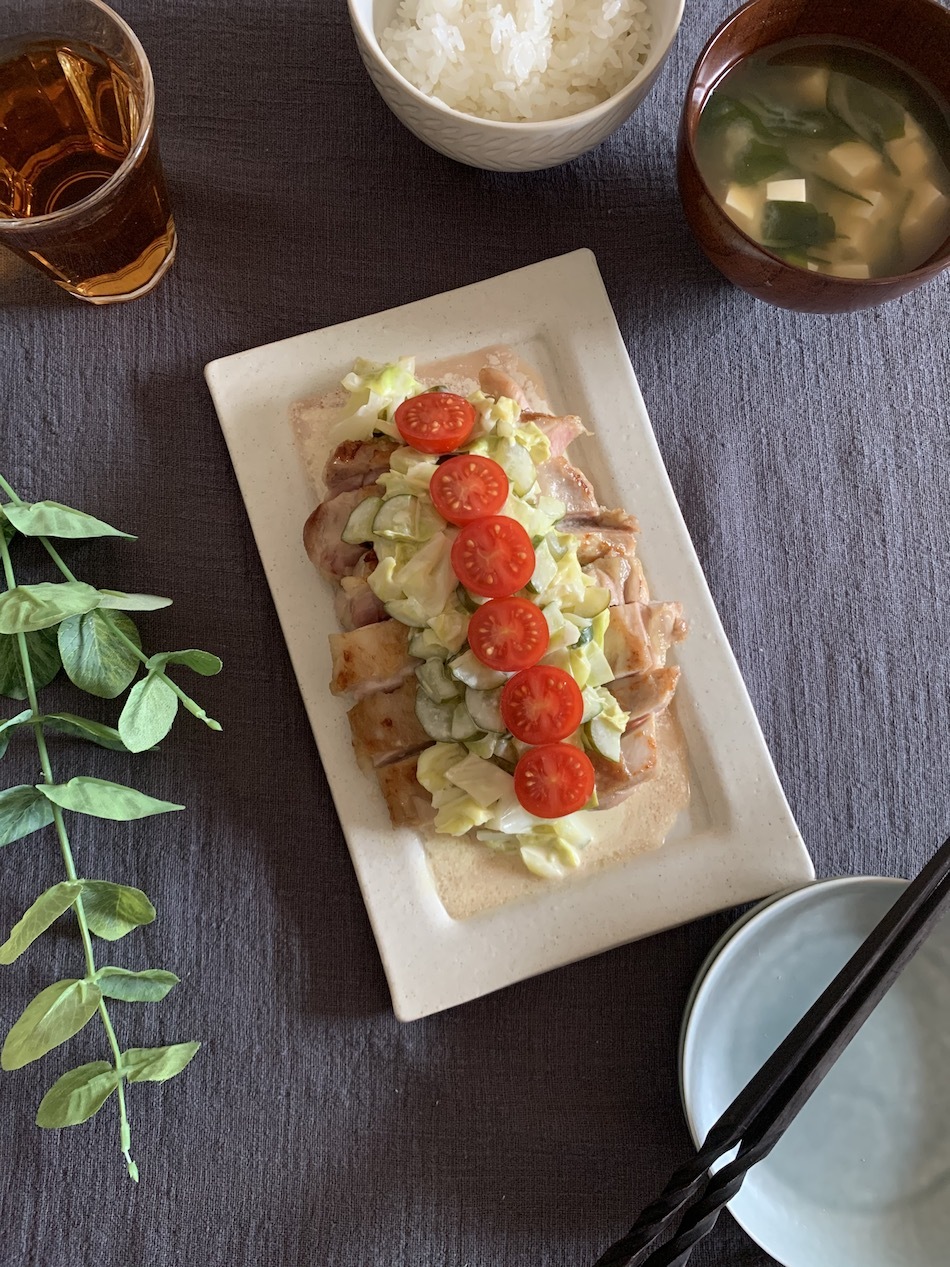 ・鶏もも肉を広げ、余分な脂身を取り除く。半量のすし酢につける。・キャベツを2cm角のざく切りにする。きゅうりを2cm幅のいちょう切りにする。プチトマトを半分に切る。