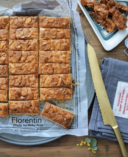 大きく焼いたつやつやのフロランタンを、俯瞰写真でおしゃれにスタイリングしました。