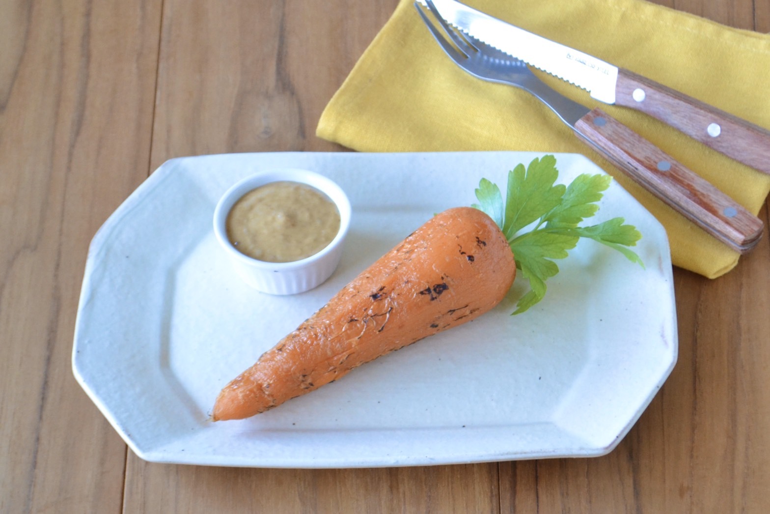 - フォークなどでヘタをくりぬき、お好みでにんじんの表面をバーナーで炙る。器に盛り付け、イタリアンパセリを飾る。