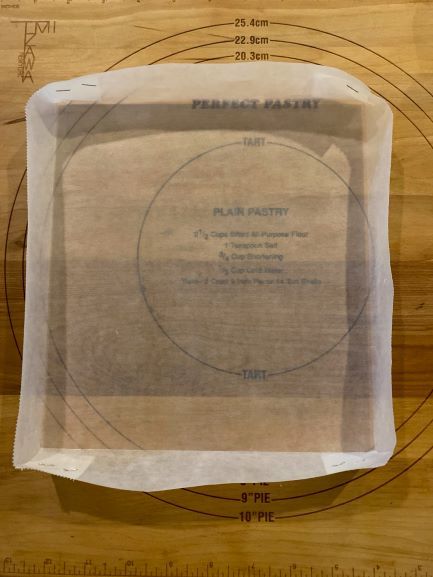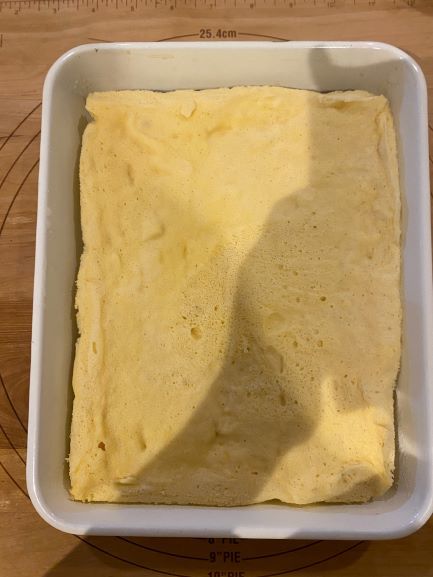1のクッキングシートをレンジの皿にのせて4を流しいれ、生地を平らにならしたらラップをふんわりかけて600wで4分加熱する。 (皿がターンしないレンジの場合は3分かけて、むきを変えてさらに1分加熱)
