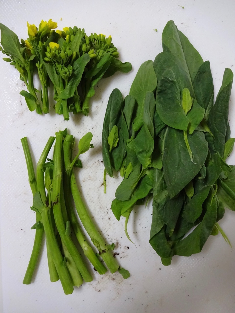 【下準備】菜の花は洗う前に花・葉・茎に分ける。花は痛めないよう丁寧に溜めすすぎする。葉は2cm大にざく切りして水が透き通るまで約3回溜めすすぎする。茎は洗ってからラップをせずに電子レンジ(500w)で30秒加熱して2cm長に切る。