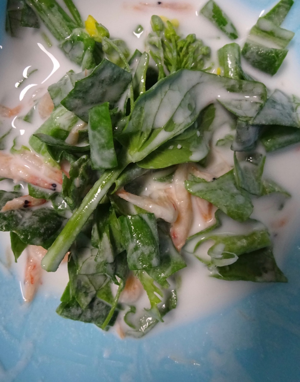 - 【下準備】菜の花の本数(6本)がかき揚げの仕上がり個数(6個)となるように、水溶き上新粉以外の材料を小分けにして置いておく。