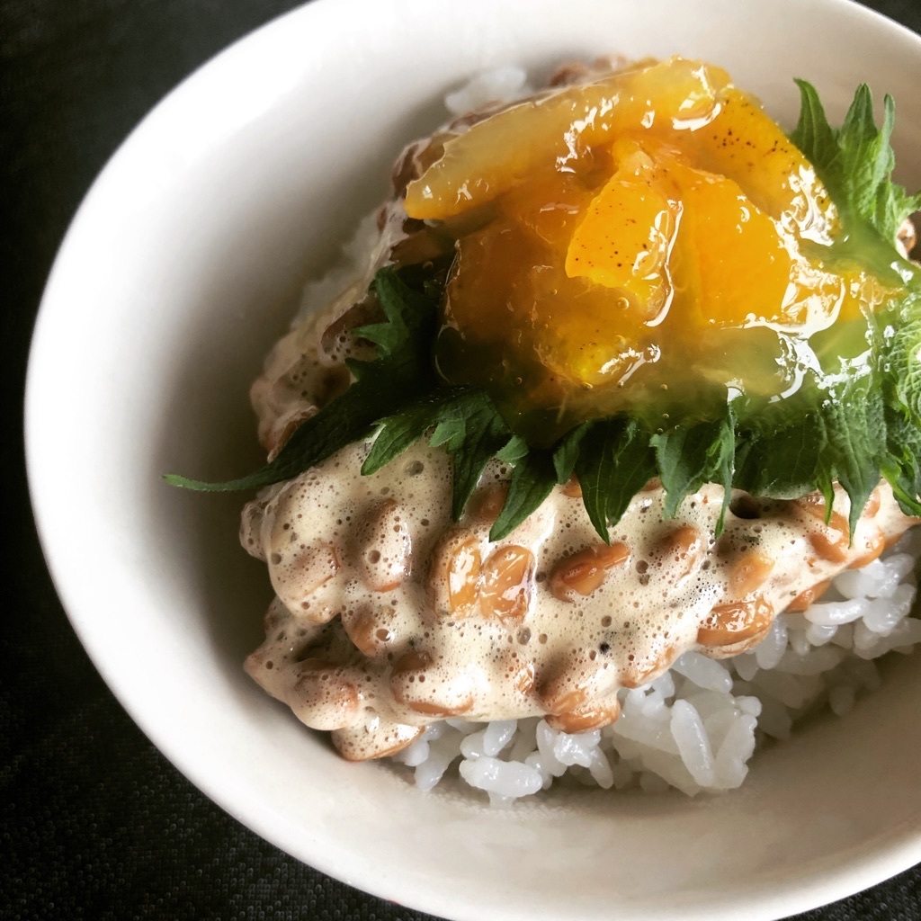 食べる柚子マーマレードの美健康な新しい楽しいレシピ♫ 納豆が大好きな貴方へ新提案! かけてのせるだけなのに、いつもとちょっと違う、いや、だいぶ違う笑! いつもの納豆ごはんが少し楽しみながら食べれる男飯。