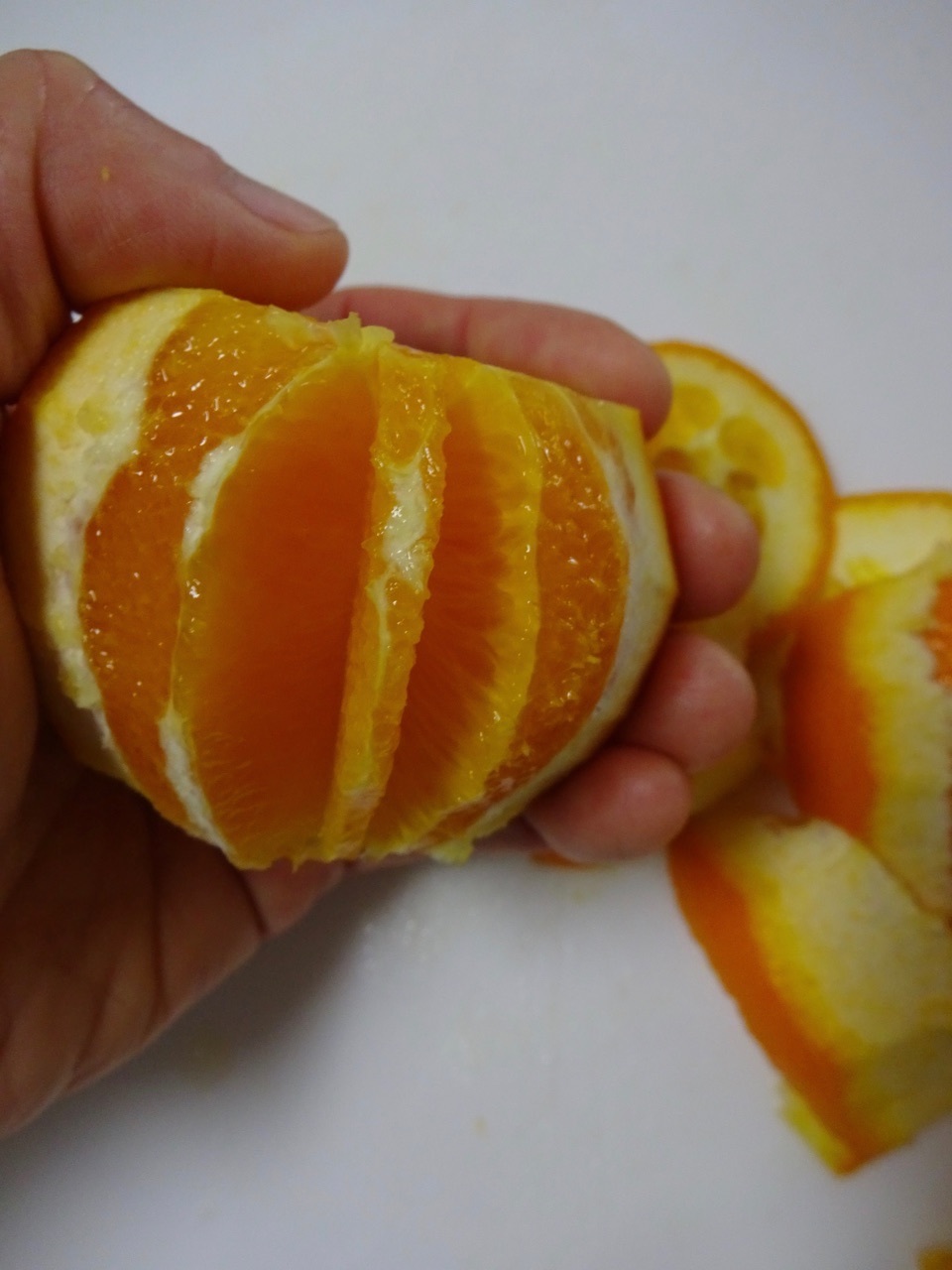 【下準備】材料を切る・せり→5cm長・生ハム→5cm長に手でちぎる・オレンジ→実を取り出す・くるみ→1cm大(切った後10gはトッピング用によけておく)