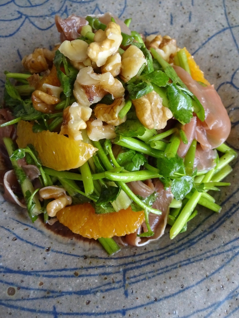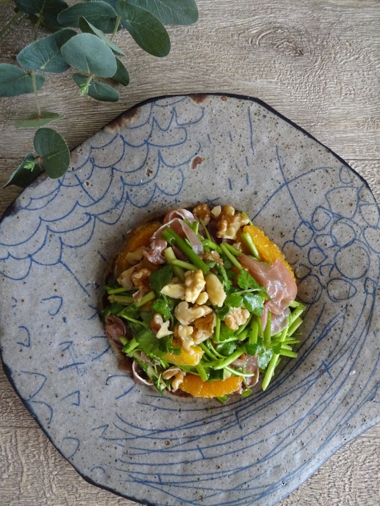 旬のせりを生のまま、生ハムと一緒にバルサミコ酢で和え、オレンジとくるみをアクセントとしたスタイリッシュで美味しい、お洒落なイタリア風サラダです。