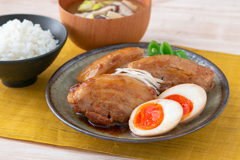 【フードスタイリング】煮物は茶色が多いので、クロスを明るめの色にすると明るい印象になります。 【撮影】明るく美味しそうな色合いに。