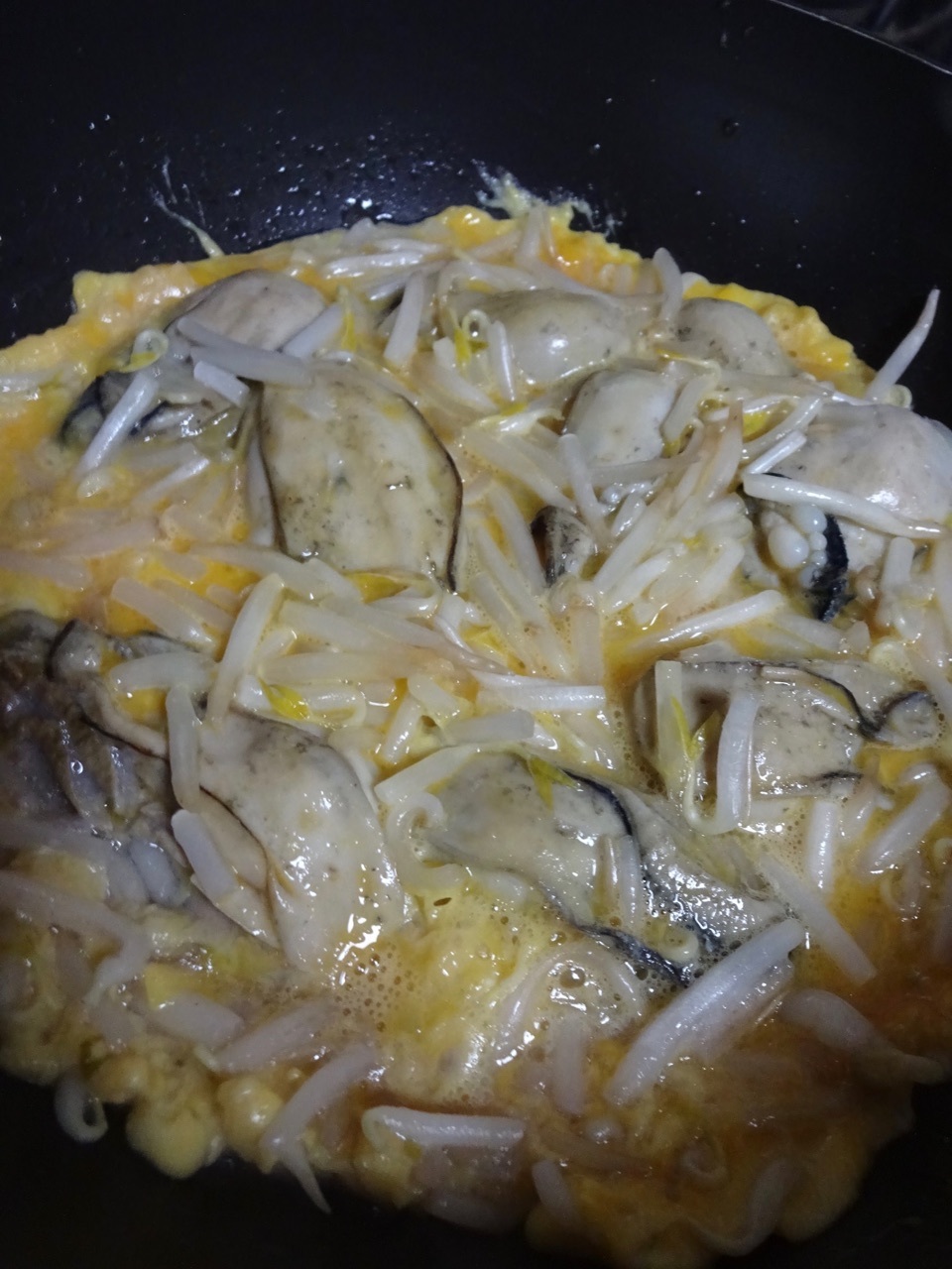 【下準備】カキを塩水でよくすすぎ、水気を切る。もやしを洗いながら指で半分に折り、水気を切る。にんにくをみじん切りにする。パクチーの葉と茎を分け、茎を2cm長に切る。ピーナッツを約0.5cm大に切るか砕く。たまごを溶いて片栗粉を入れ、よく混ぜ合わせる。