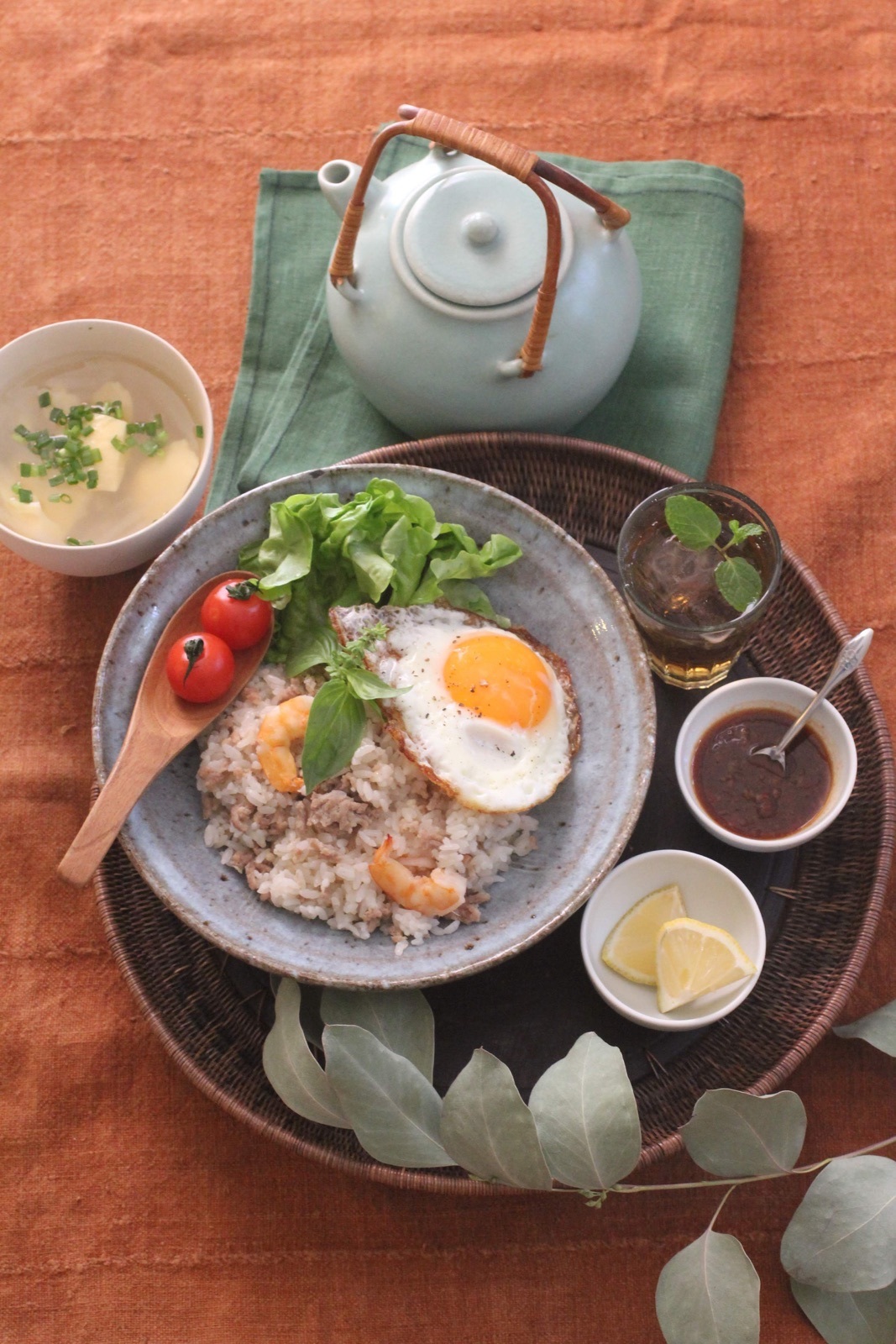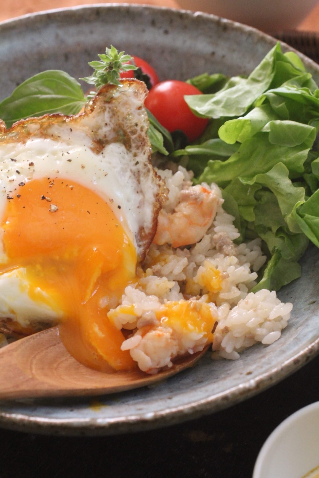 - 目玉焼きを焼き、バジルと一緒にご飯の上に乗せて、目玉焼きのタレをかける