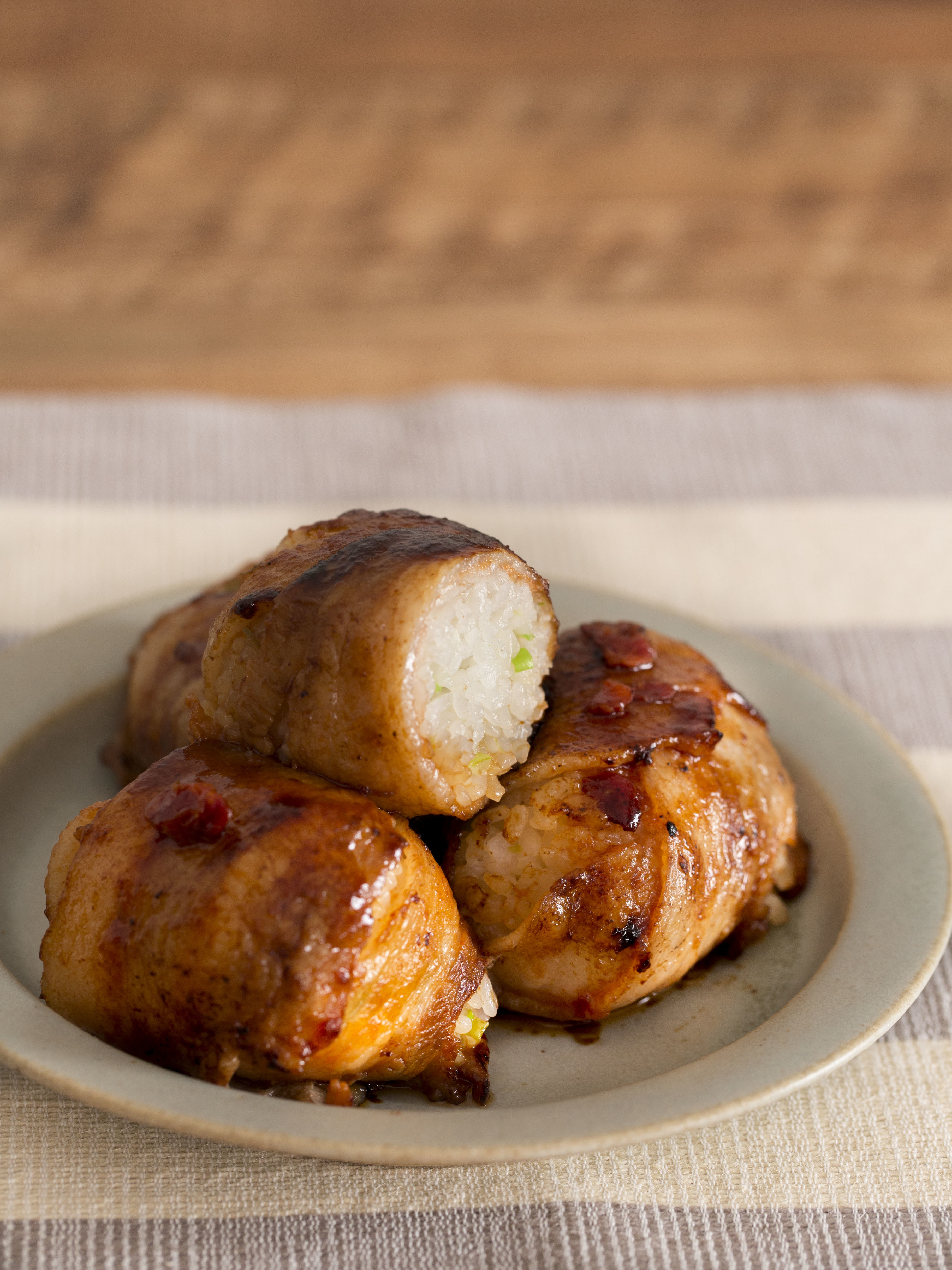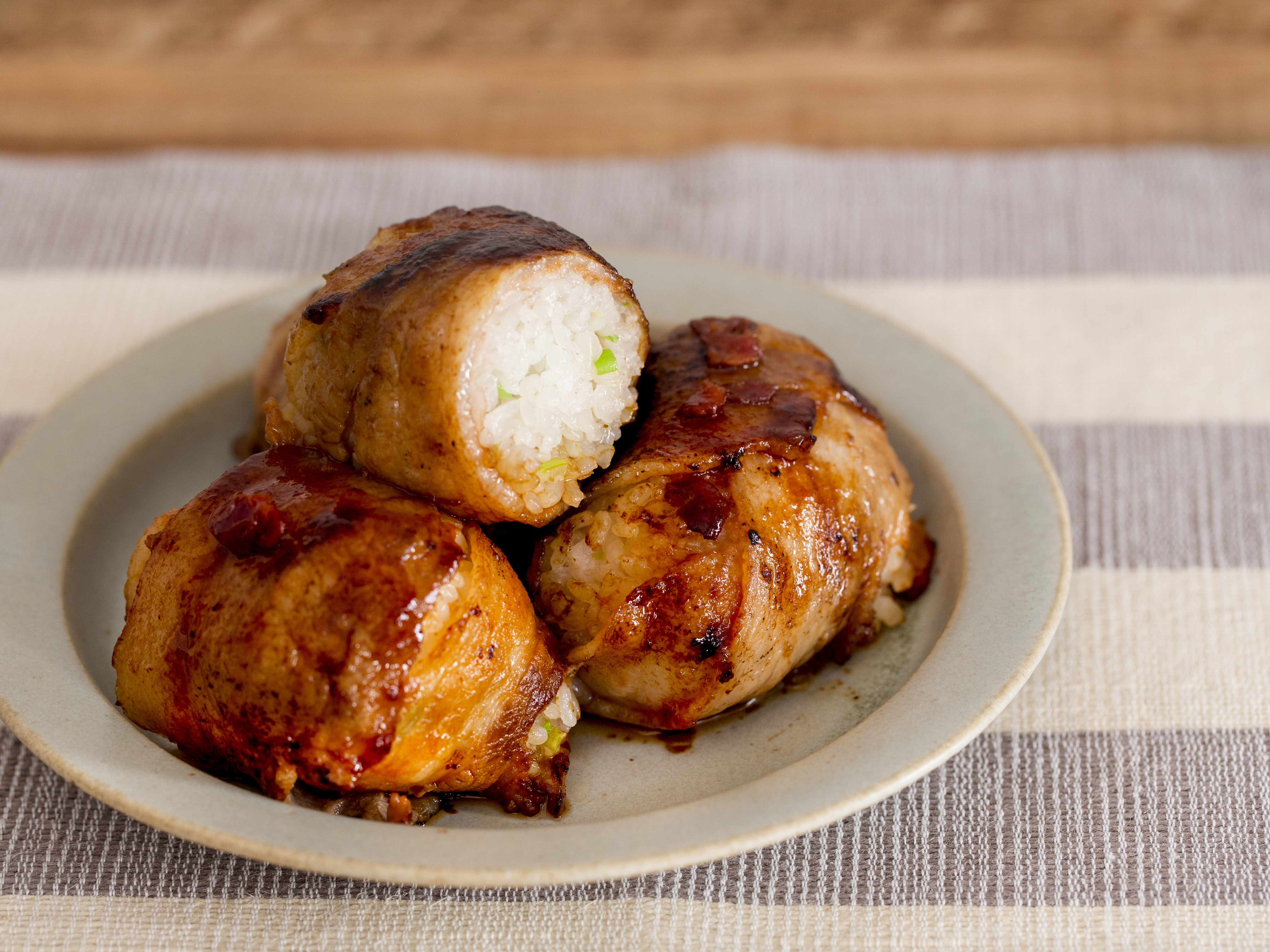 - 漬け込んだ豚バラ肉を工程2に各1~2枚ずつごはんが表に出ないように巻き付ける。