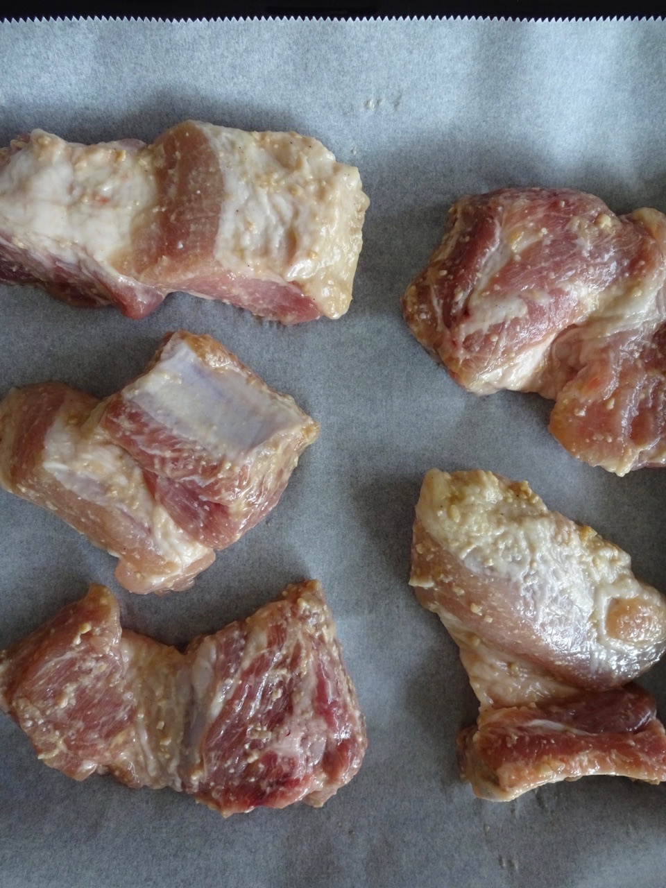 2を冷蔵庫から取り出し、オーブンを200℃に設定して予熱をかけ、天板にクッキングシートを敷いてスペアリブを並べる。