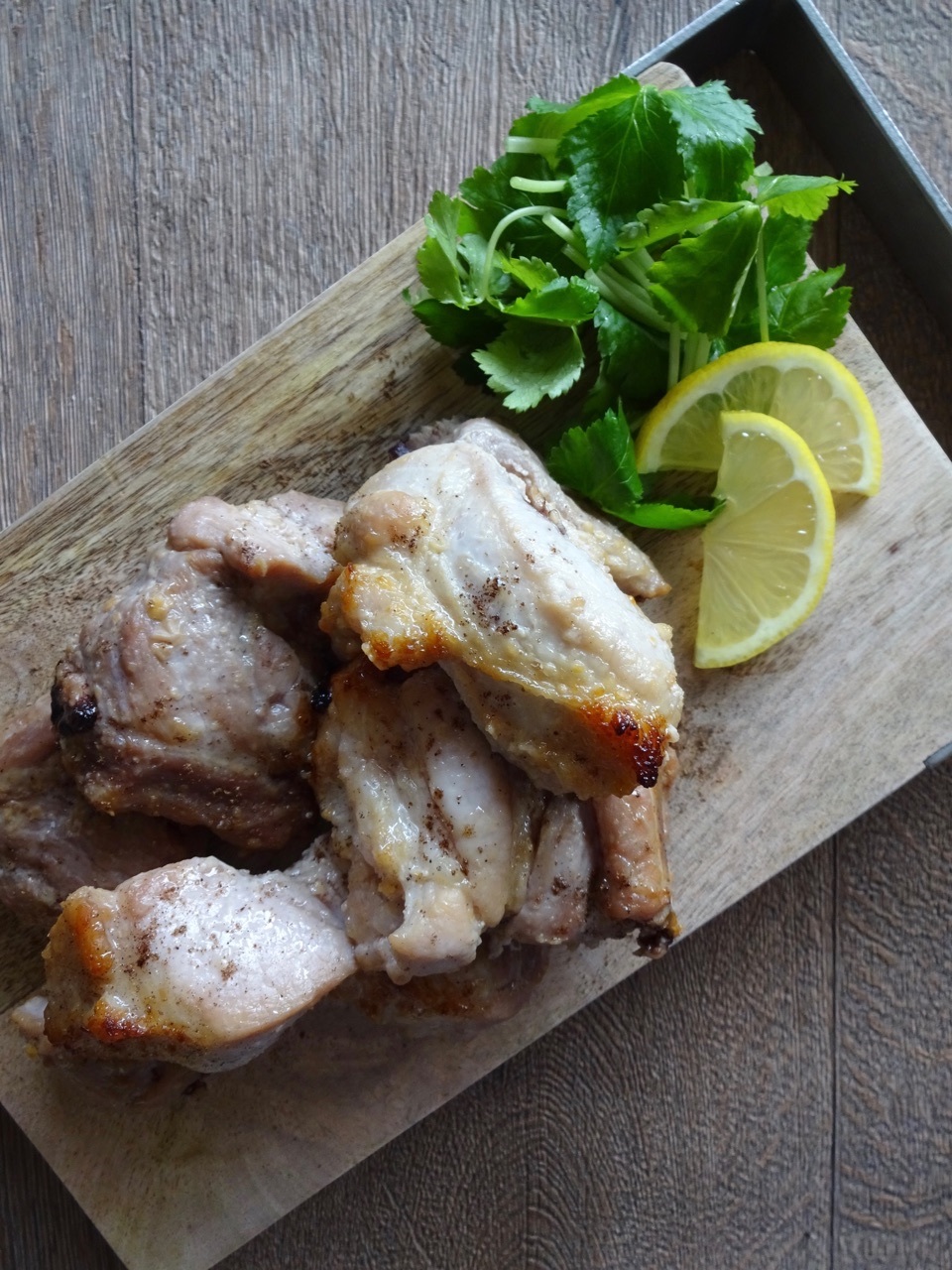 - 3が焼きあがったら器に盛り、みつばとレモンを添え、花椒を振りかける。