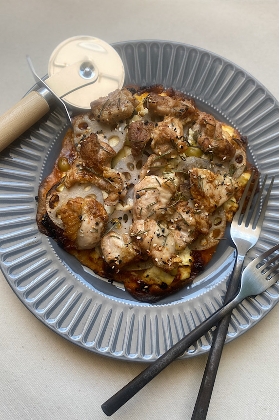 - 焼き上がった生地に、ソース、豆腐、具材、ケッパー、ローズマリーの順に載せてオリーブオイルをかけてオーブンで20分焼く