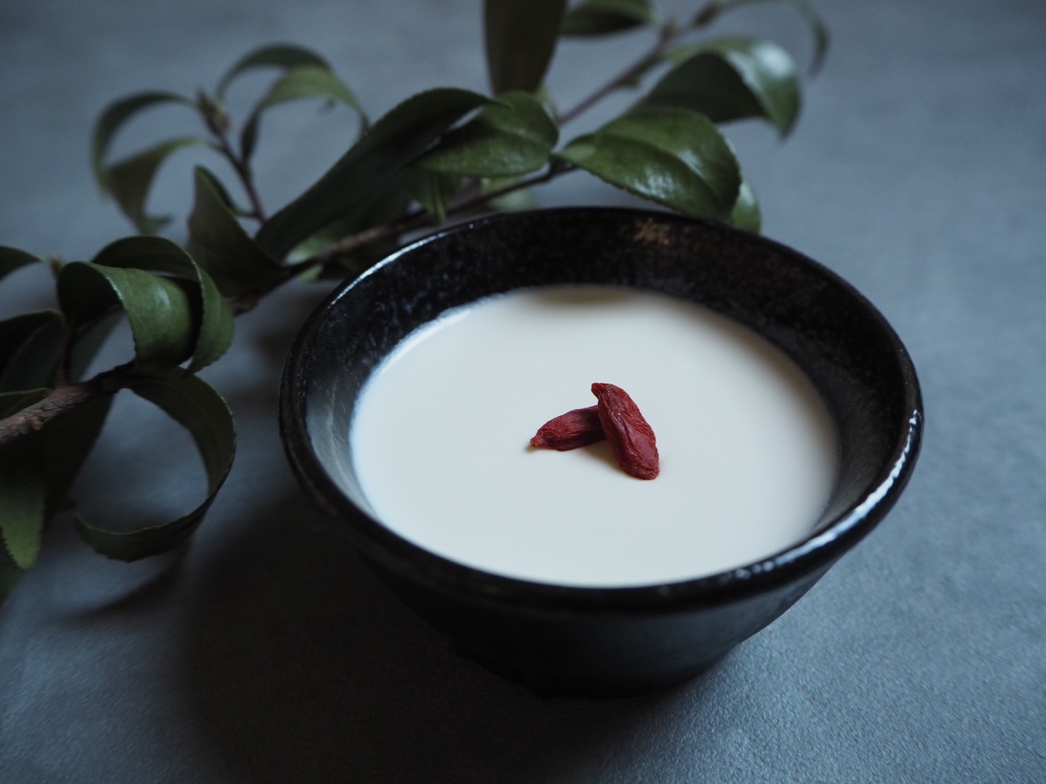 - 型に流して冷蔵庫で1時間冷やし固め、クコの実をのせて完成。