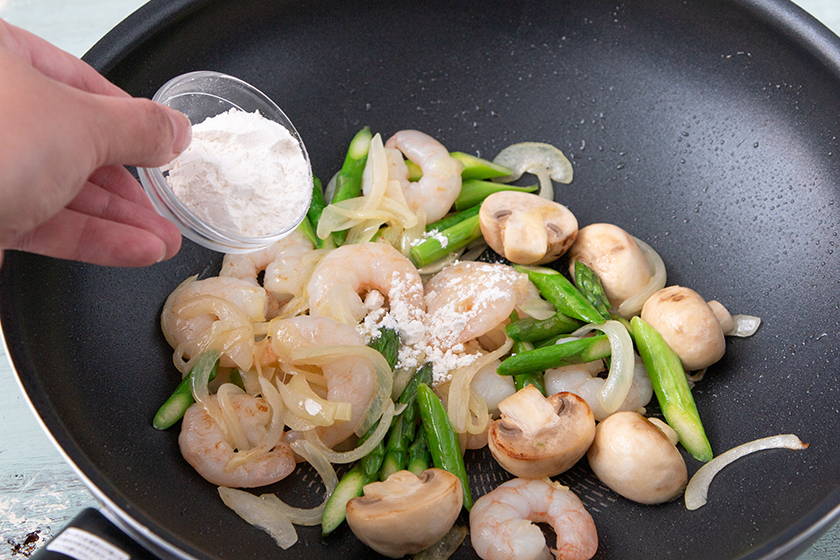 野菜がしんなりしたら、小麦粉を入れ全体にまぶし火を消す。