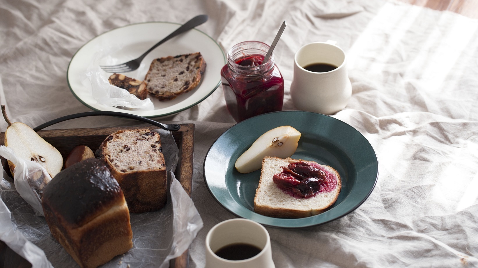 既に正午近い朝の為、少し赤みをホワイトバランスで入れています。布はあえてくしゃくしゃにし、陰影をつけることで、布の動きだけでなく、人の動きも感じ取れるようになります。 お皿はぴかぴかのものではなく、光をやさしく反射してくれるお皿をあえて使用しました。お皿までマットなものを使用すると、布、パン、板のトレーが否反射な質感なので思いスタイリングになってしまいます。