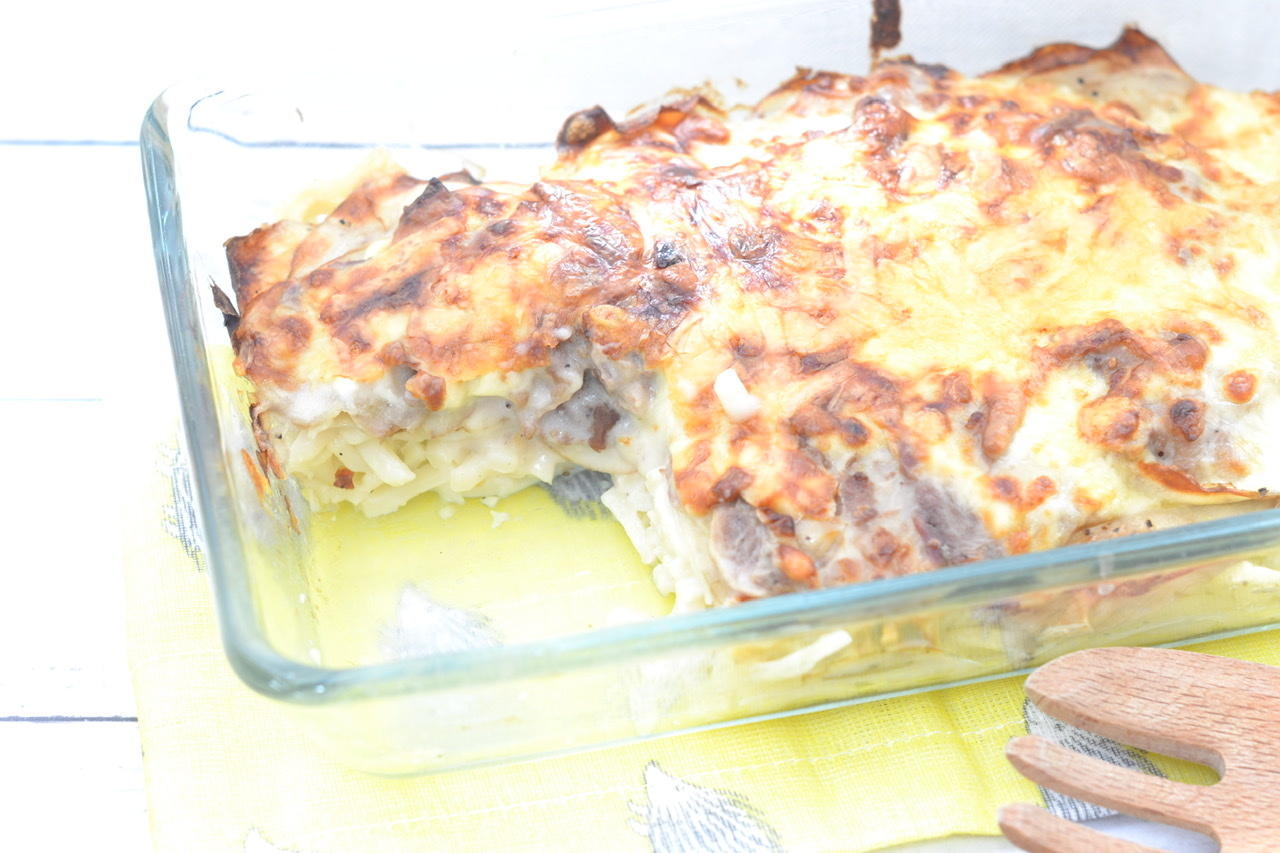 ゆでうどんの上に新じゃがいものスライスを敷きつめて♪牛バラ肉&ホワイトソースにチーズをたっぷりかけてこんがり焼きます♪