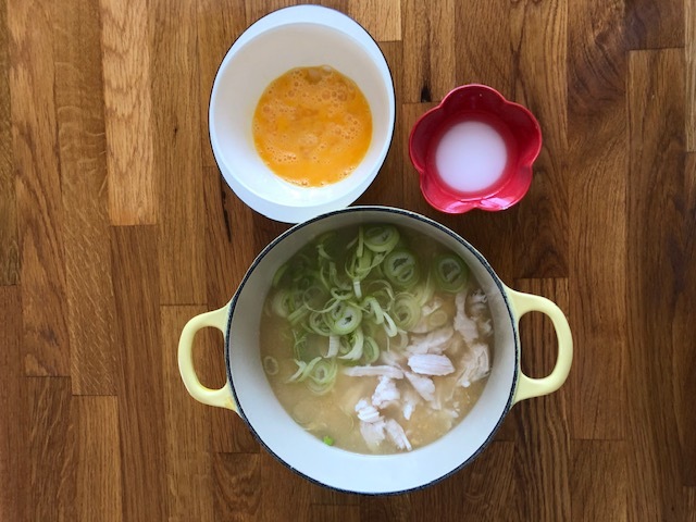 サラダチキンは食べやすい大きさにさき、長ねぎは5mm幅位の輪切りにし、卵はといておく。