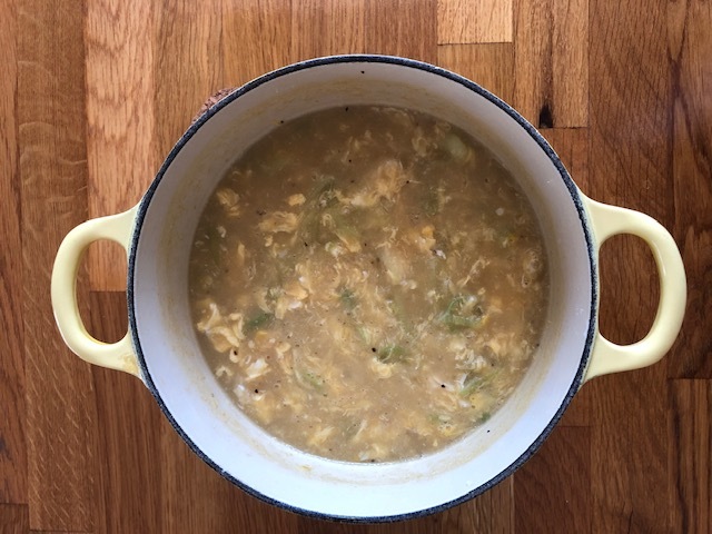 水溶き片栗粉と卵は、必ず混ぜながら入れましょう。片栗粉のダマを防ぐのと、卵は均一にふんわりします。