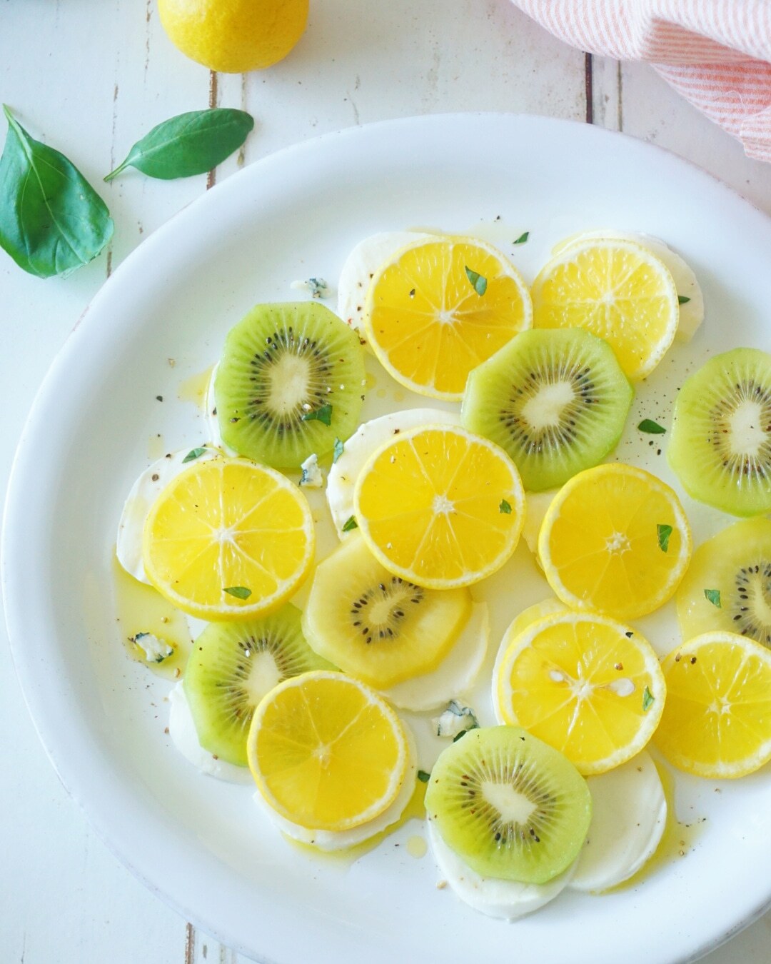 - お皿にモッツァレラチーズをのせ、その上にキウイフルーツと柑橘類をのせる。はちみつを垂らしミントをちぎりながり散らす