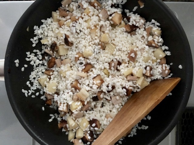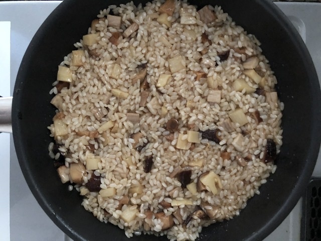 フライパンにごま油を熱し、具材・もち米の順に加え炒め水分をとばす。(中強火)