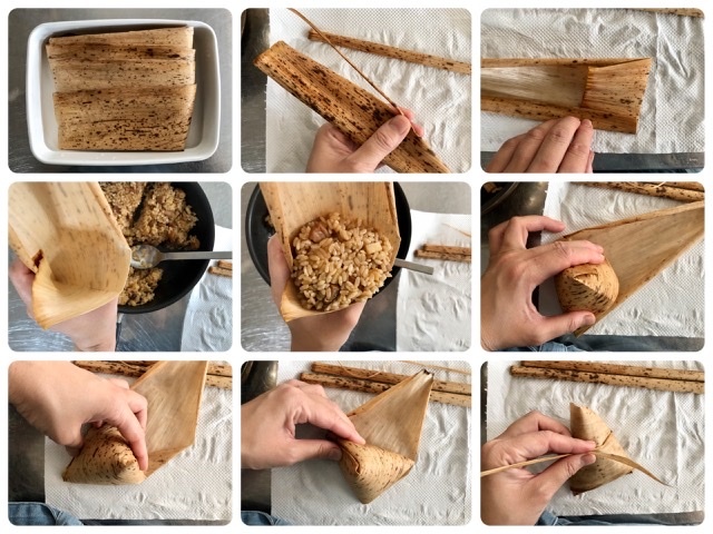 竹皮の側面・手前を折り上げポケットを作り、工程3を詰める。