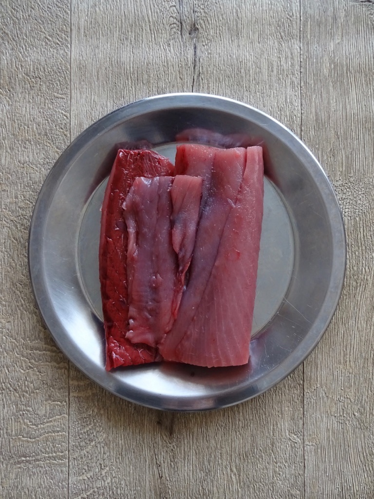 【下準備】キハダマグロのドリップをキッチンペーパーで拭い、両面に塩を振り15分置いたら再びキッチンペーパーで水気を拭き取る。