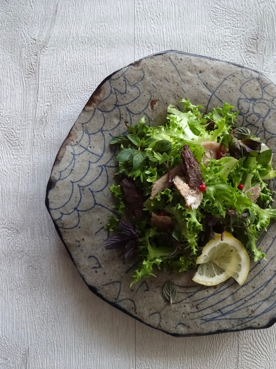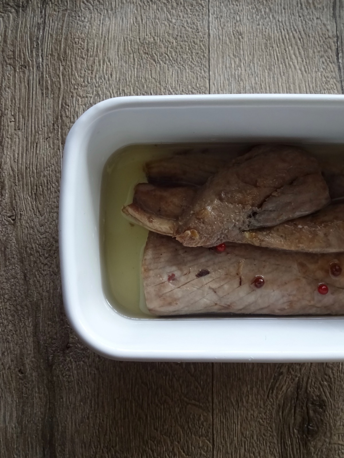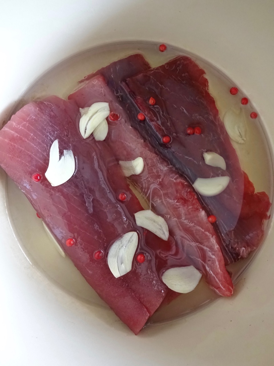 キハダマグロのアラをにんにく、ピンクペッパーと一緒に菜種油で煮込んだ自家製ツナです。サラダだけでなく、炒め物にも活用出来る、魚料理水準のツナレシピです。