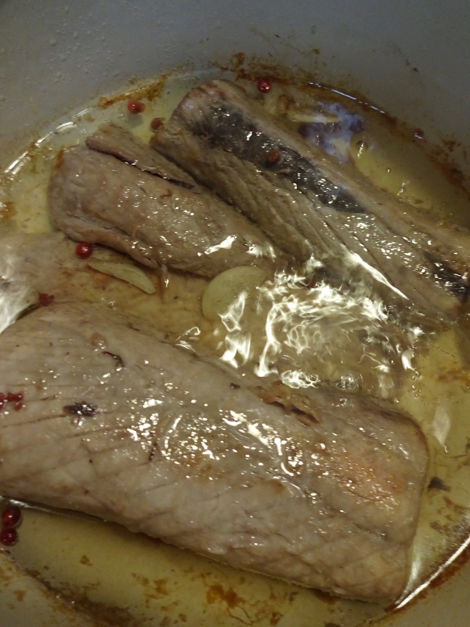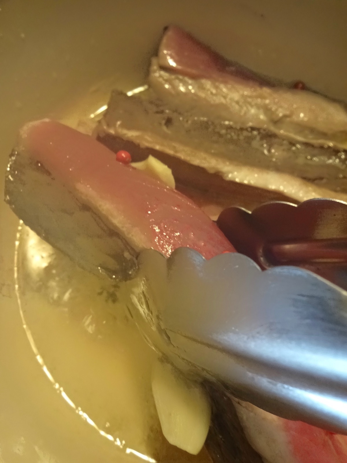 3が煮立ったらキハダマグロを裏返し、とろ火にして火が通るまで約20分煮る。その間、定期的にキハダマグロを上下裏返して全体に火が通るようにする。