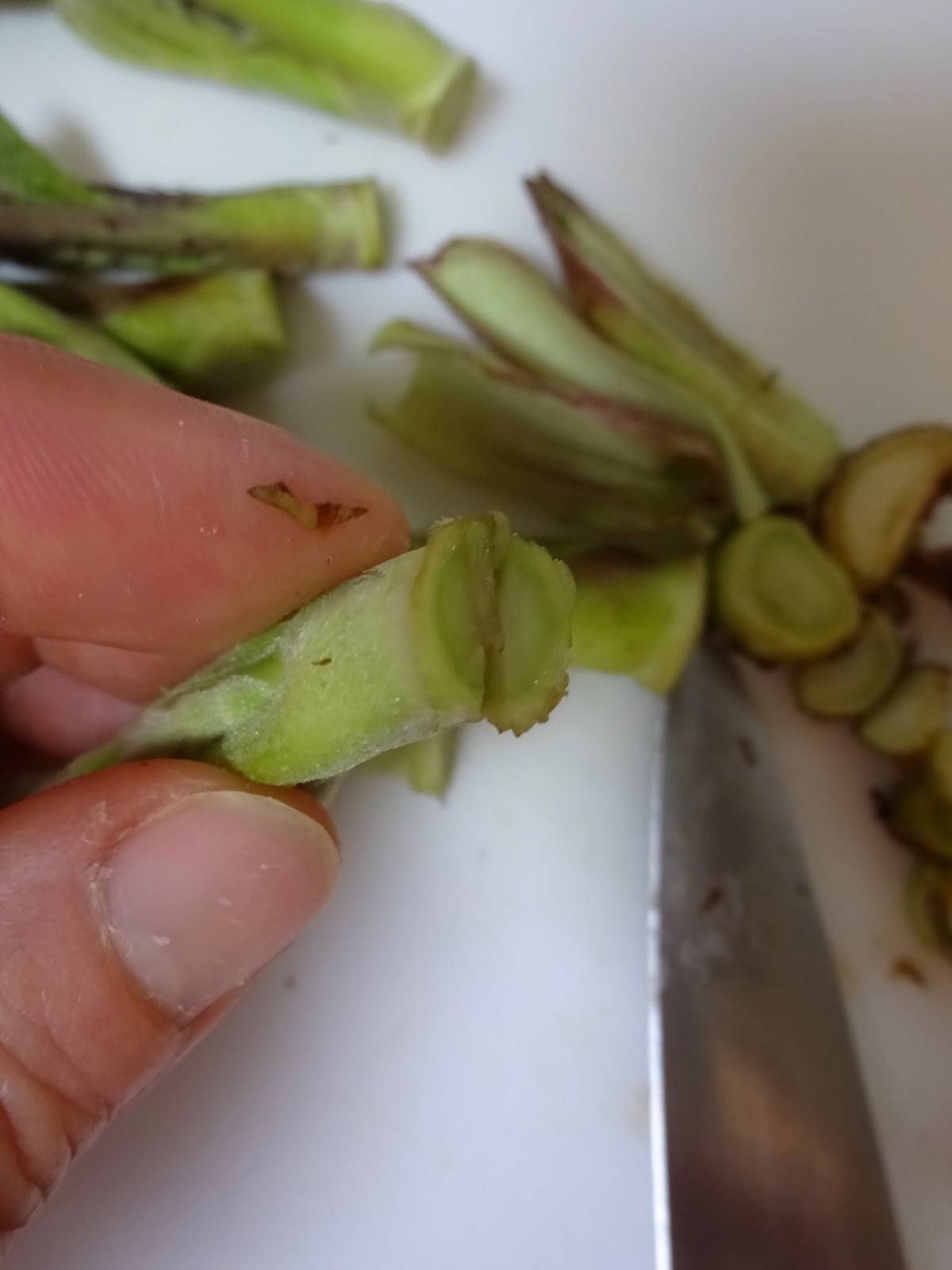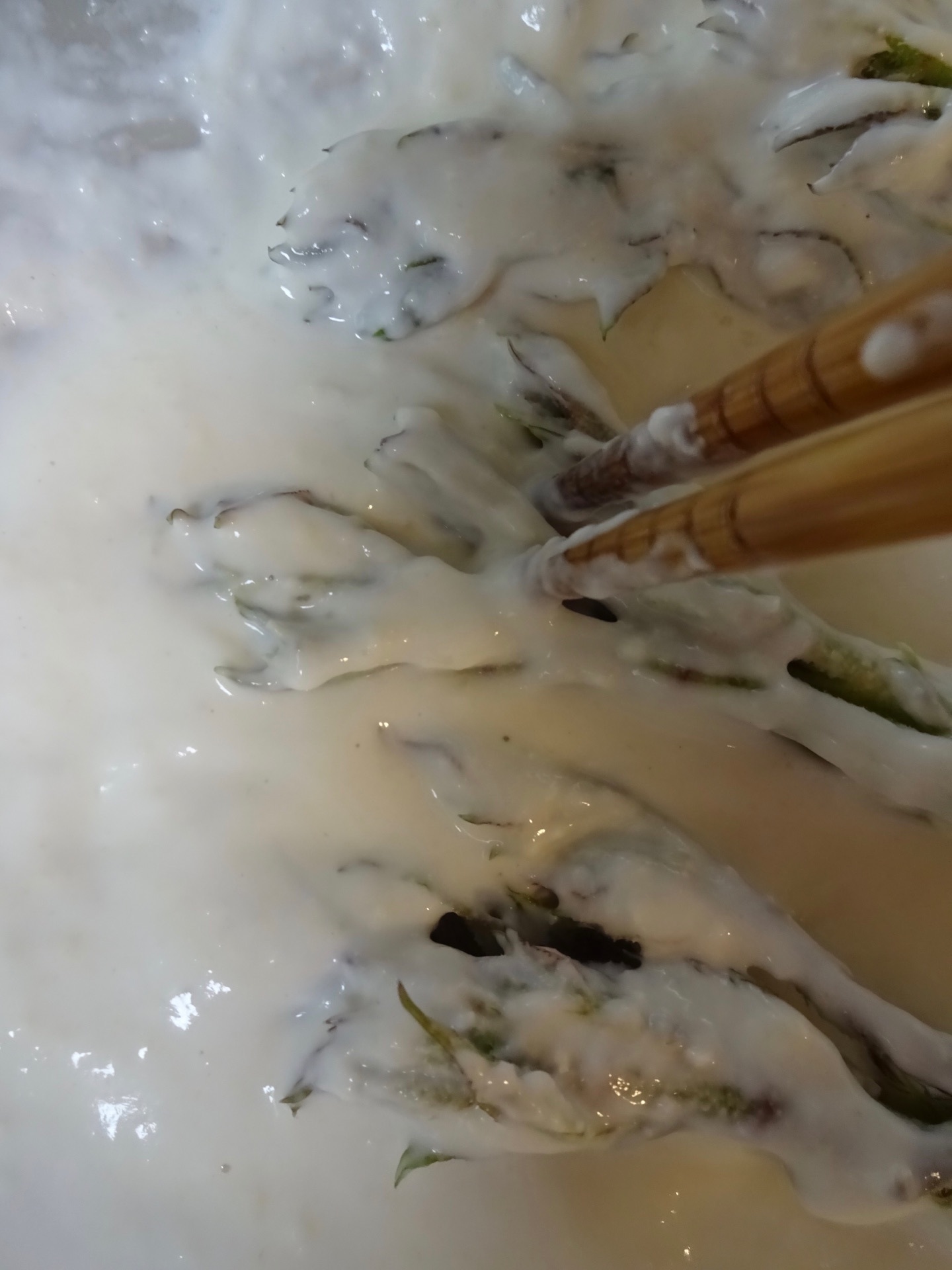 【下準備】たらの芽のはかまを取り除き、茎の切り口を切り落として切り込みを入れる。水で軽く洗ってキッチンペーパーで水気を拭く。
