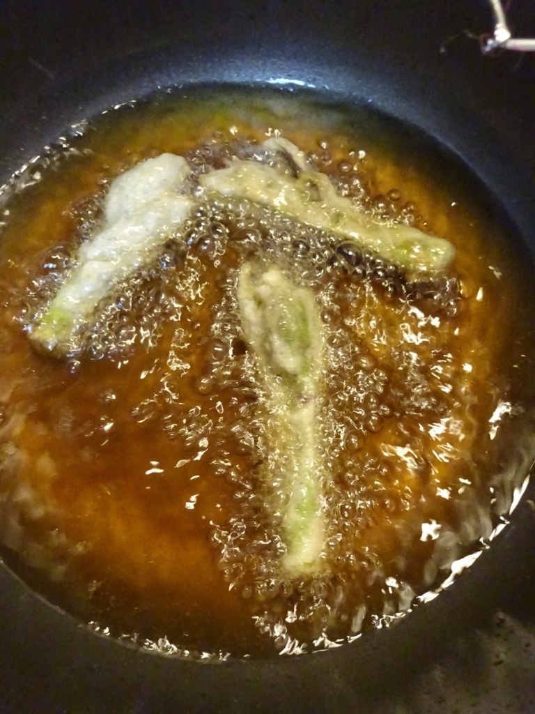 鍋に油を注いで中火にかけ180℃に熱し、たらの芽を半量入れる。火が通り、揚げ色がほんのり付くまで約3分揚げて油を切る。残りの半量も同様に揚げる。