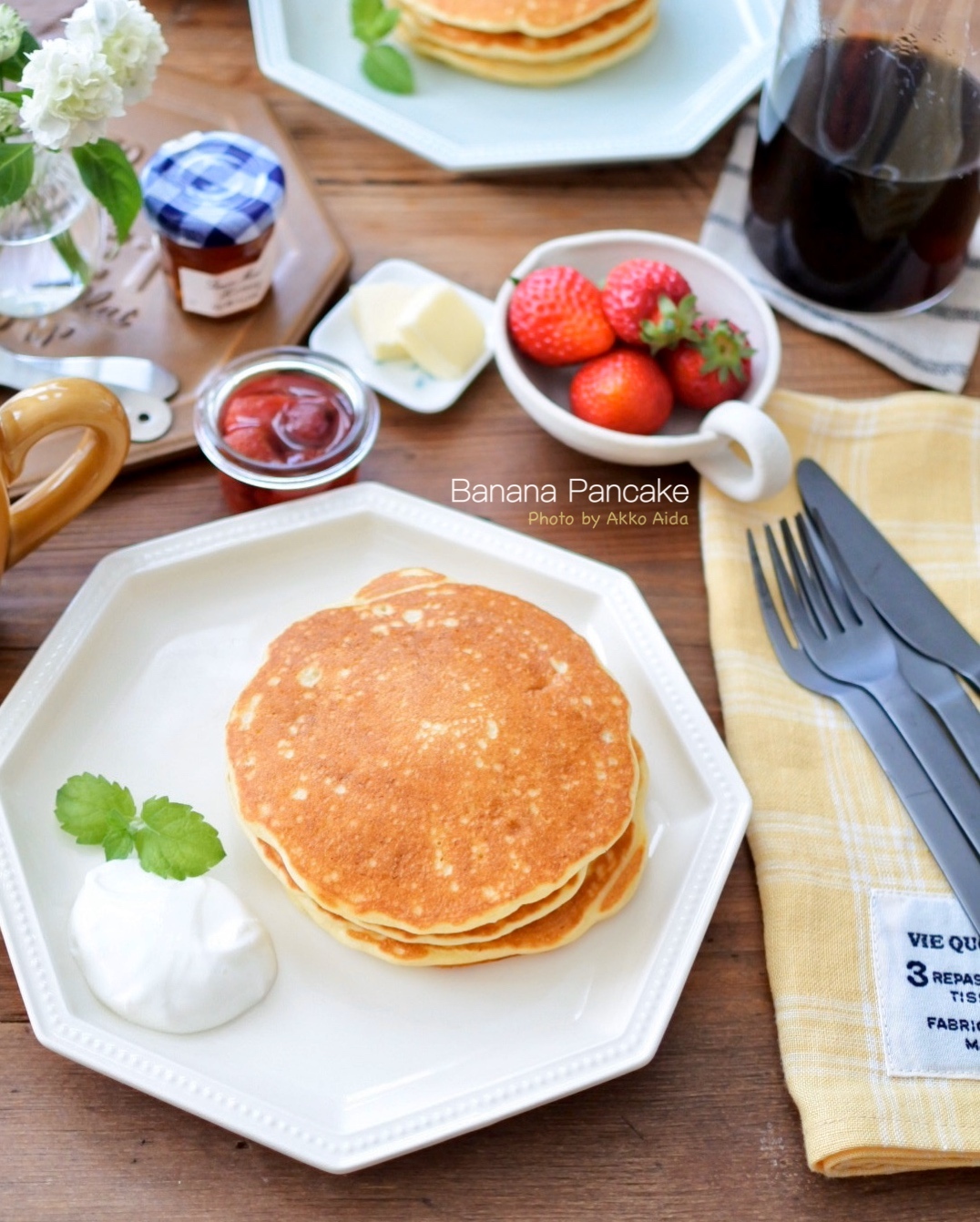 米粉で作るバナナのパンケーキです。ふんわり軽くバナナの優しい甘さのパンケーキ。グルテンフリーです。