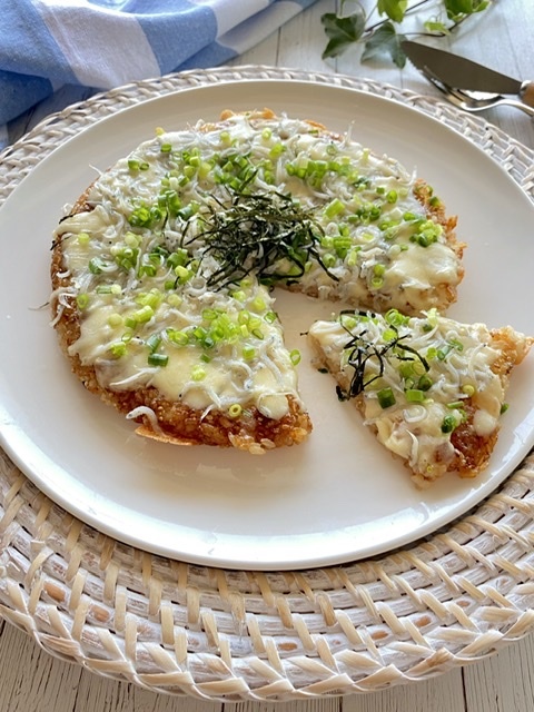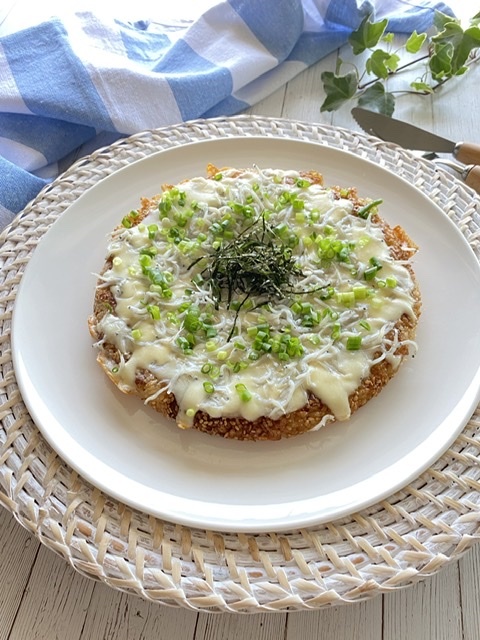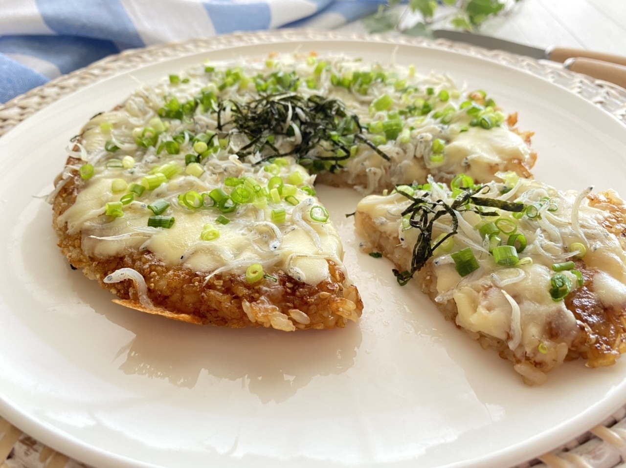 オーブン要らず!フライパンひとつあれば簡単にできるしらすの和風ライスピザです。